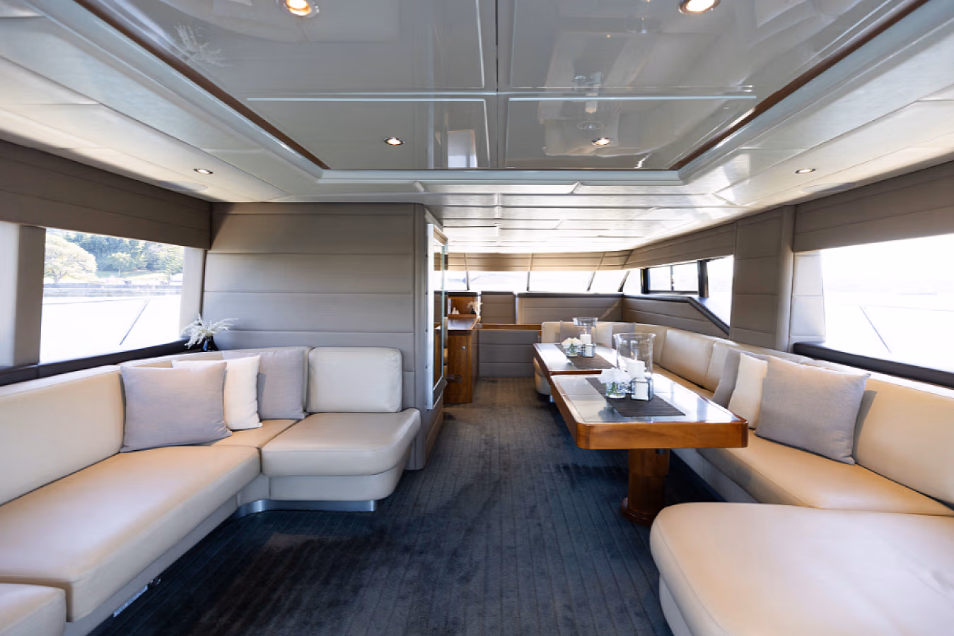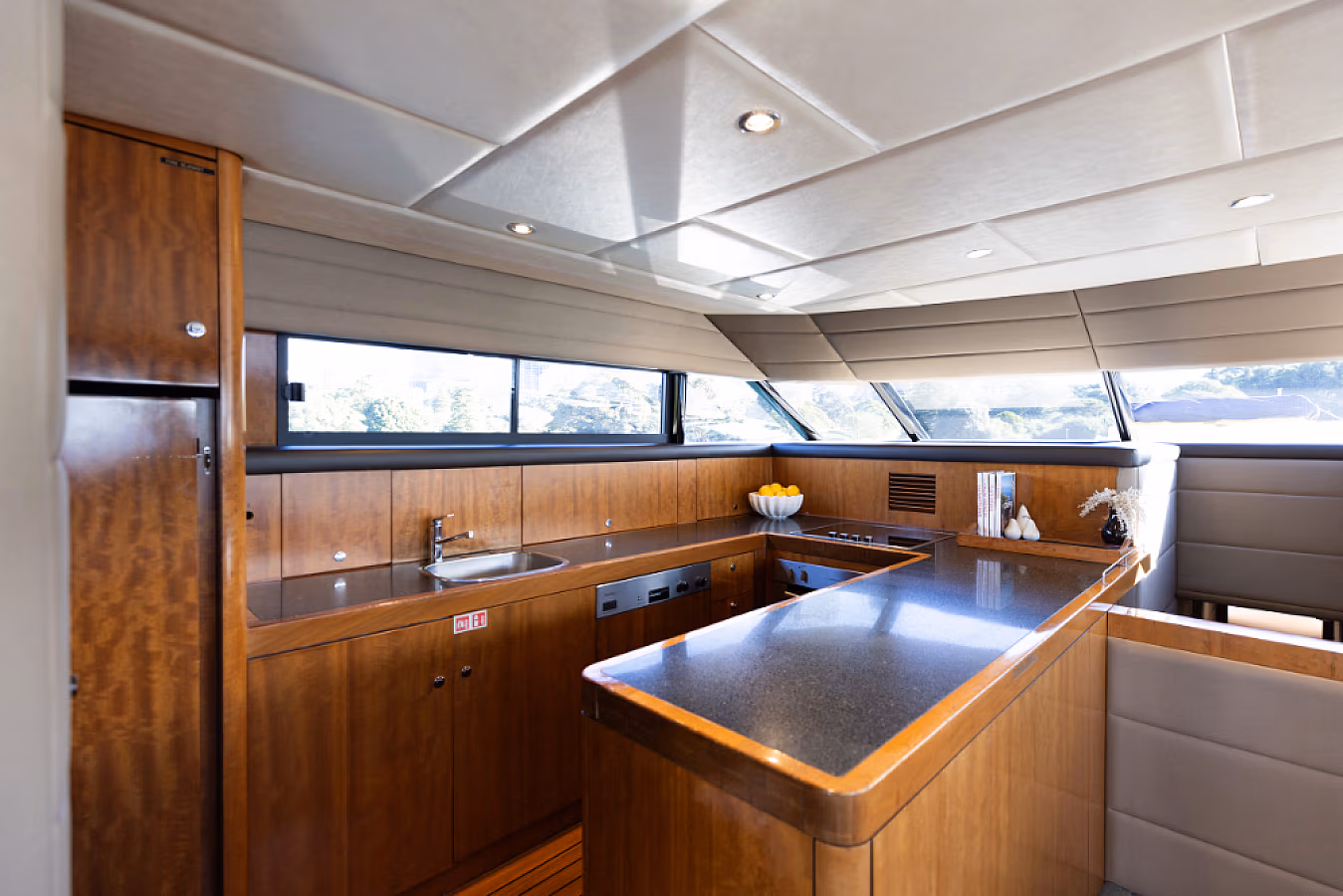 On the upper deck, the fly bridge provides yet another entertaining area for guests to enjoy. The enclosed cockpit features a retractable sunroof offering guests a comfortable day on the harbour, regardless of the elements.