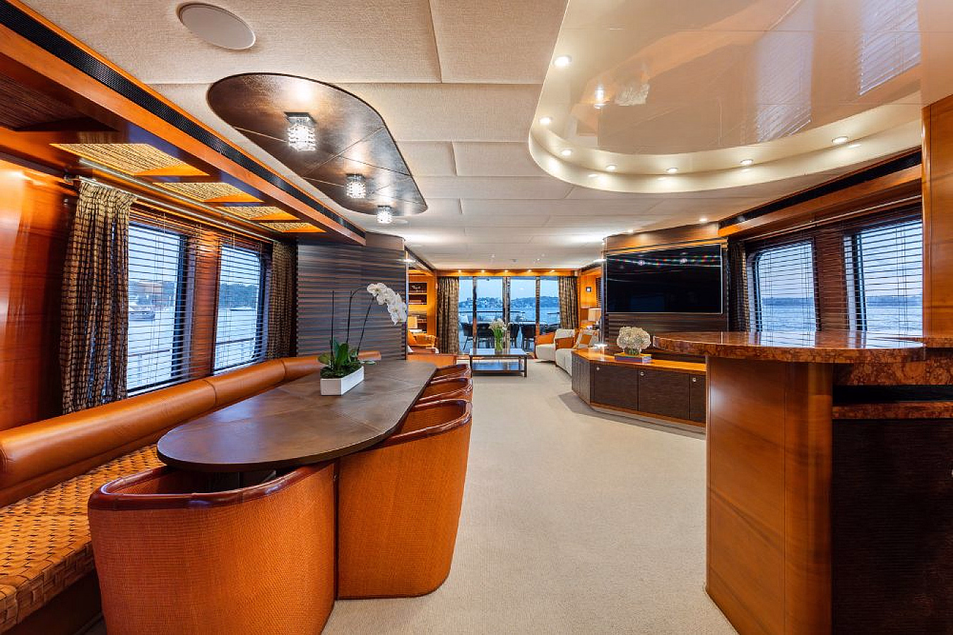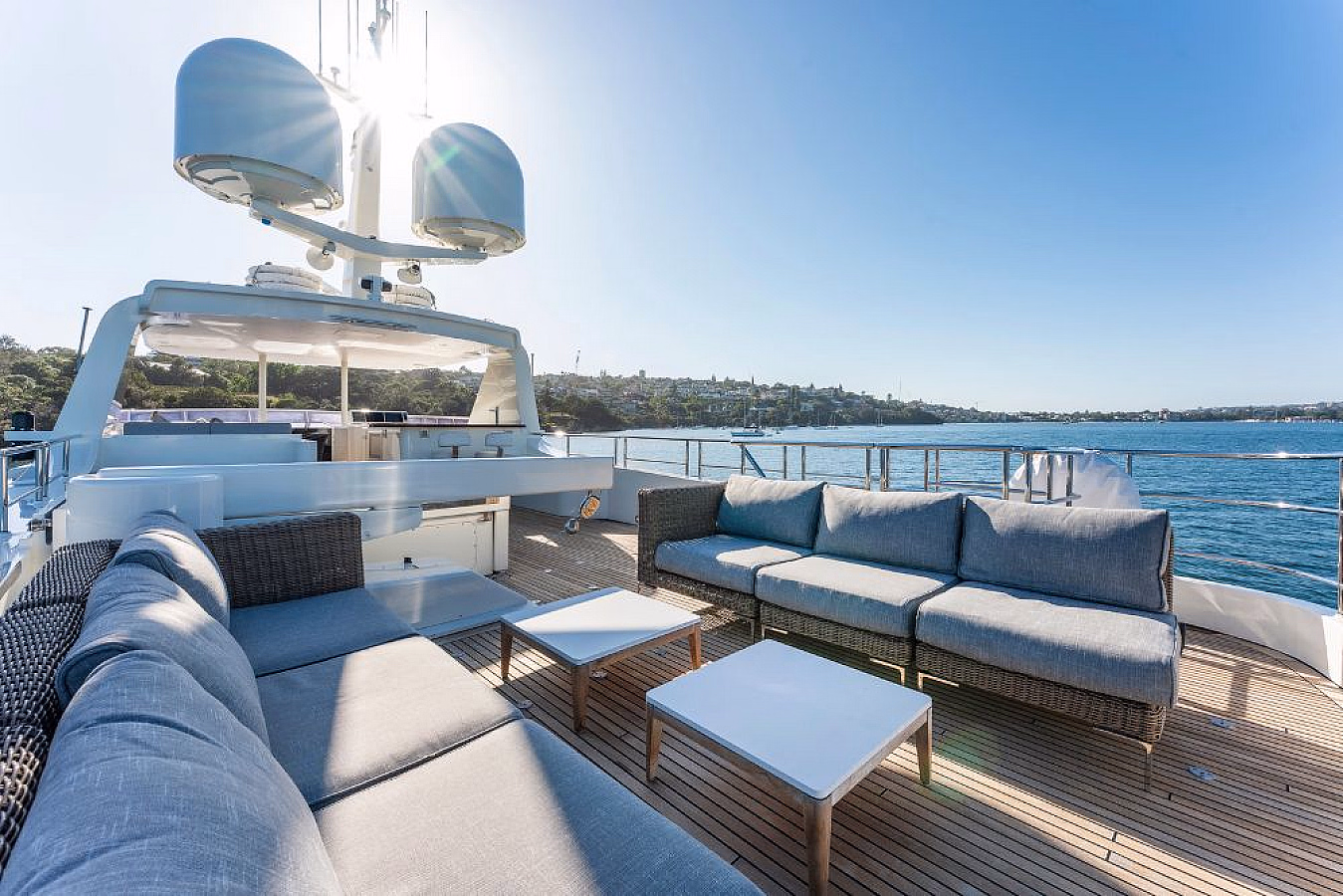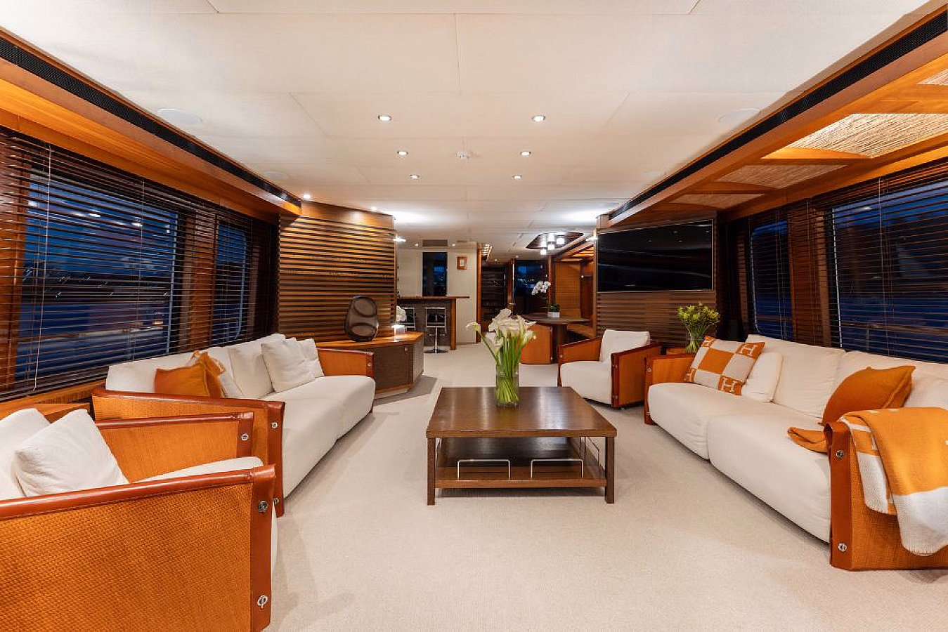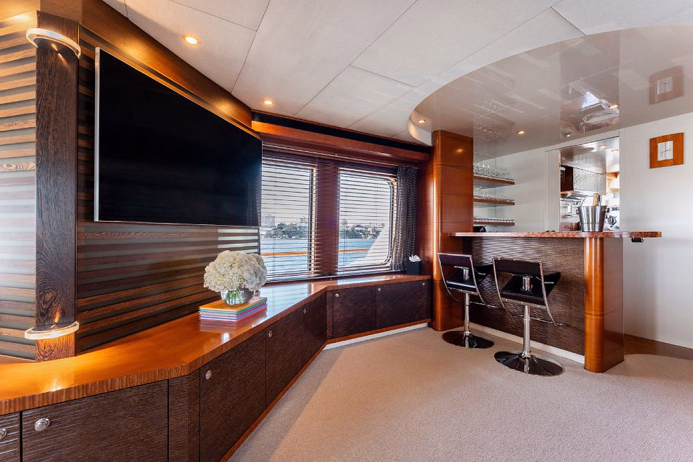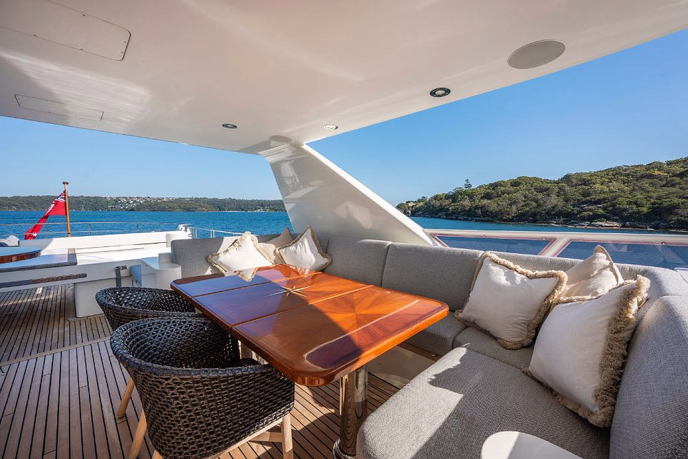 Step inside the elegant salon with plush seating and a formal dining area, or enjoy al fresco dining for nine on the aft deck. The flybridge invites you to unwind with a Jacuzzi, full-service bar, and spacious sun lounges, creating the ultimate setting for entertaining or simply soaking in the harbour views.