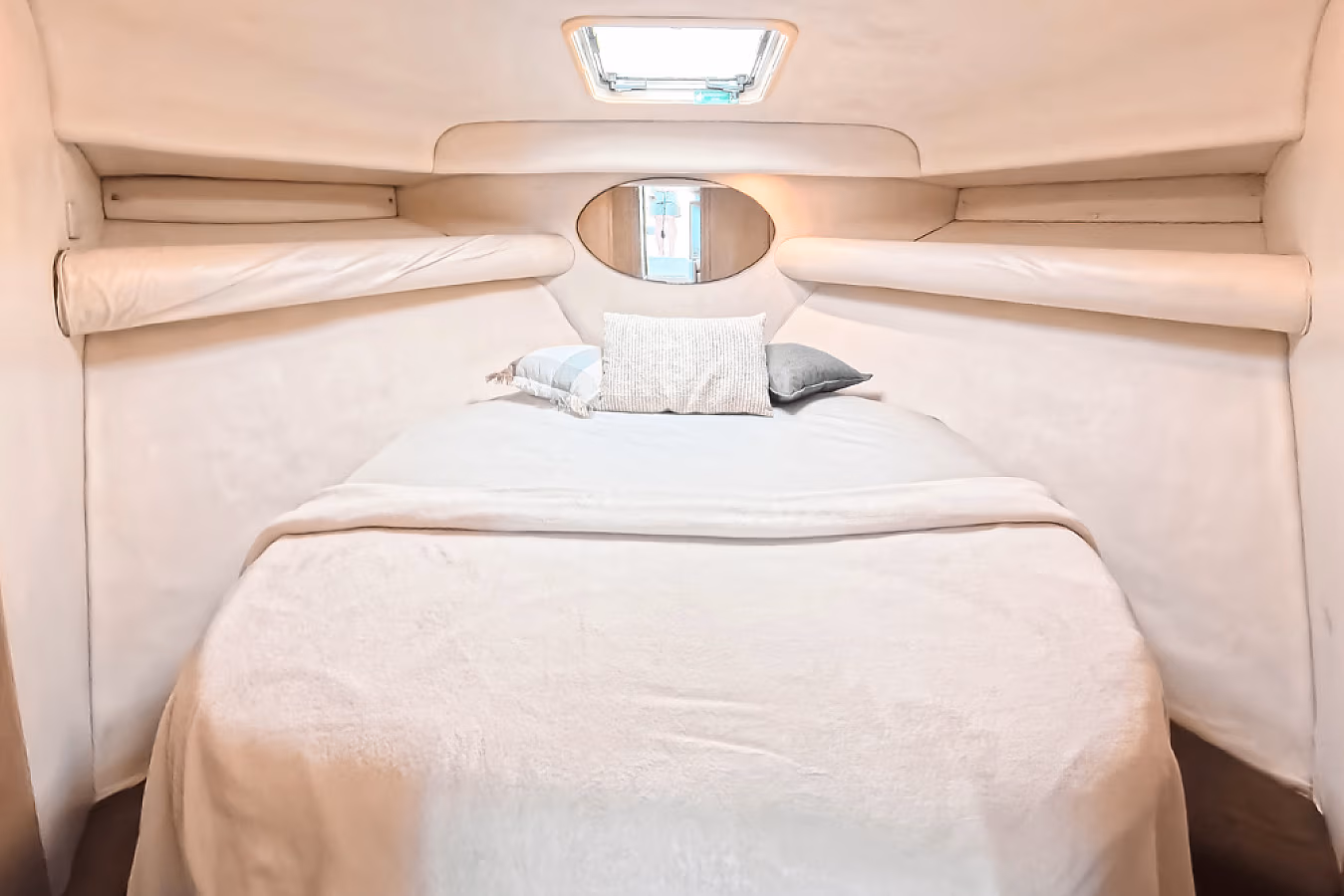 This boat functions well as a family cruiser with a surprisingly spacious interior. Below decks, the oak-finished interior provides a sleeping capacity for four people, including a large forward cabin with an island berth. The salon dinette converts to double berth, and the Riviera’s large head compartment includes a separate shower stall. A mirror-backed cocktail cabinet separates the dining area from the forward stateroom.