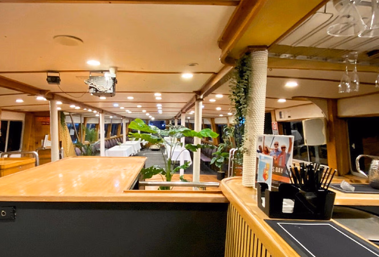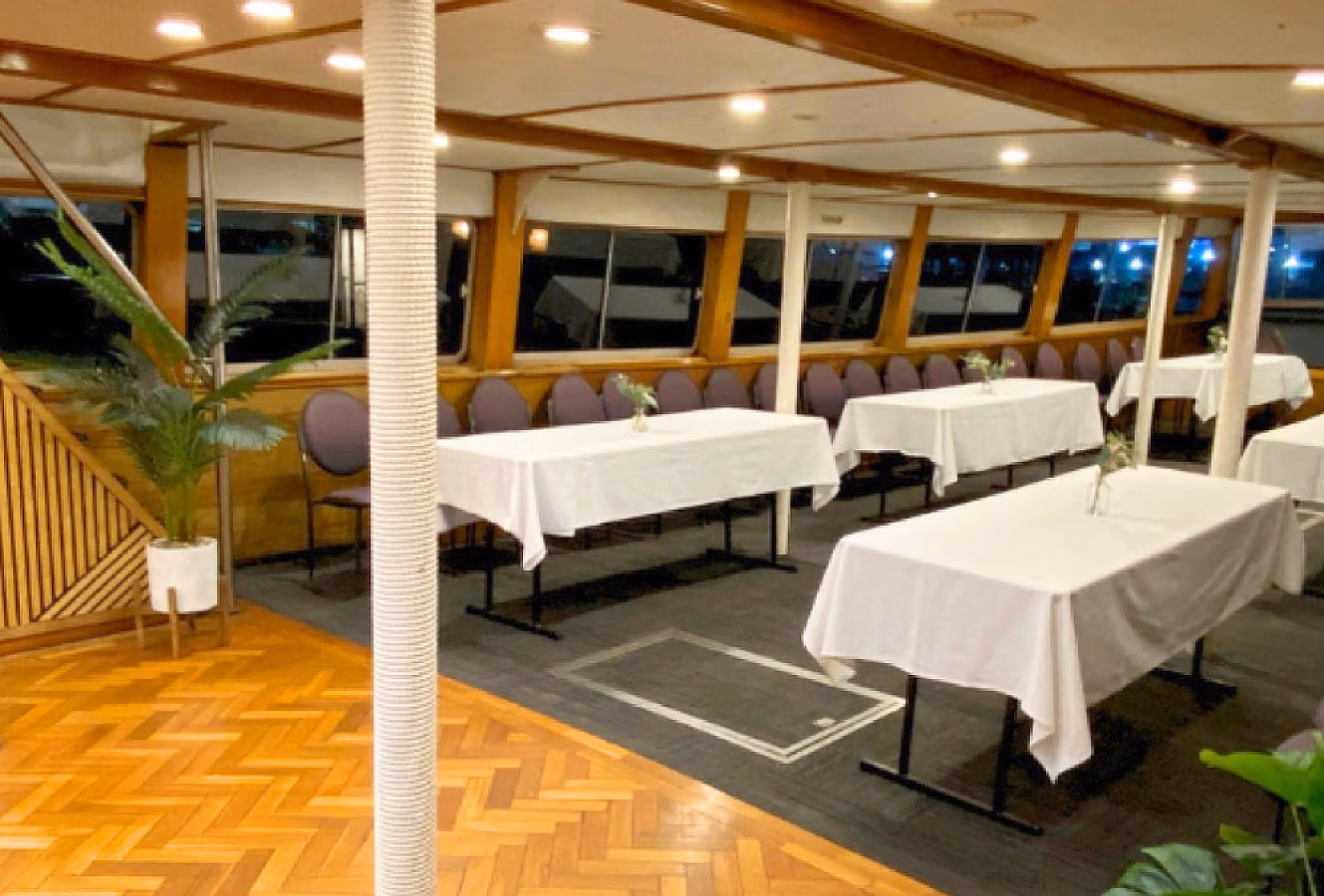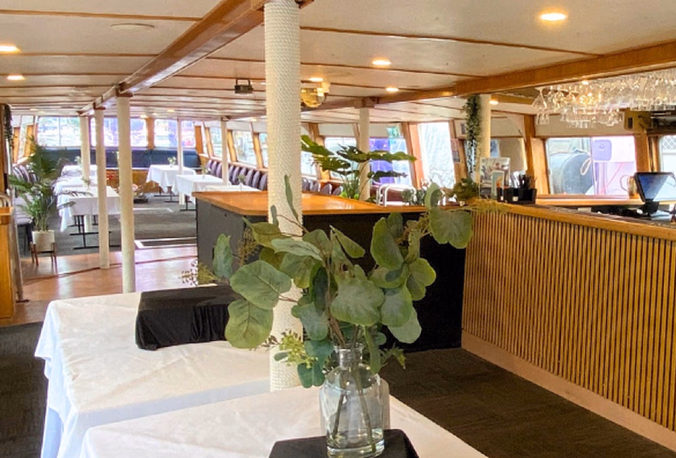 Enjoy two decks with outdoor areas, and large windows which surround the vessel. The classic wooden interior makes you feel comfortable and at ease. This is the perfect way to enjoy this spectacular night, with your friends and family on board!