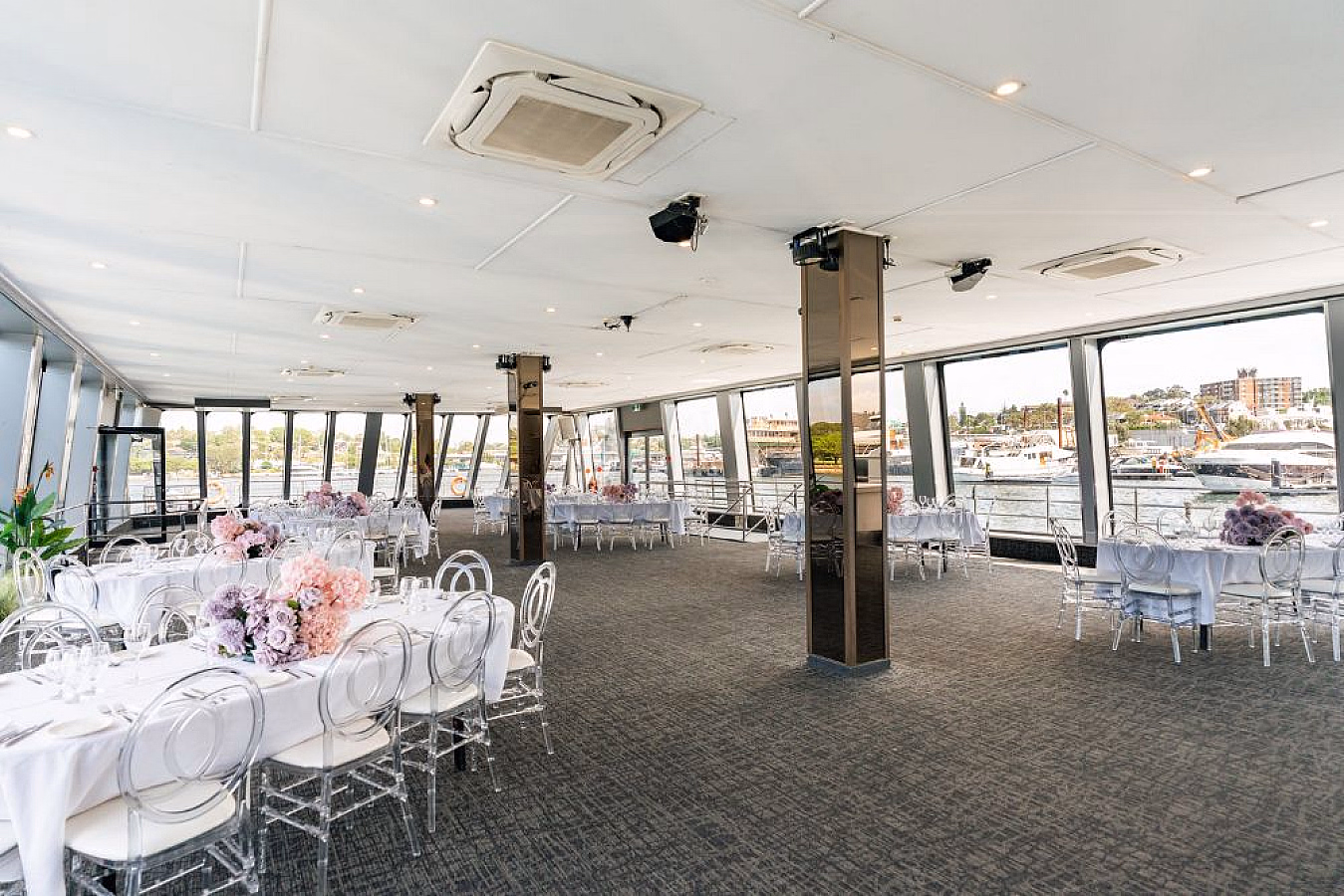 This large glass-walled vessel is built for big celebrations, featuring multiple levels, wide open decks, and 360-degree harbour views. Guests enjoy a festive selection of roaming canapés, buffet stations, desserts, and a full drinks package. With a live DJ and vibrant party atmosphere, Bella Vista delivers a high-energy NYE experience surrounded by Sydney’s iconic skyline and fireworks.