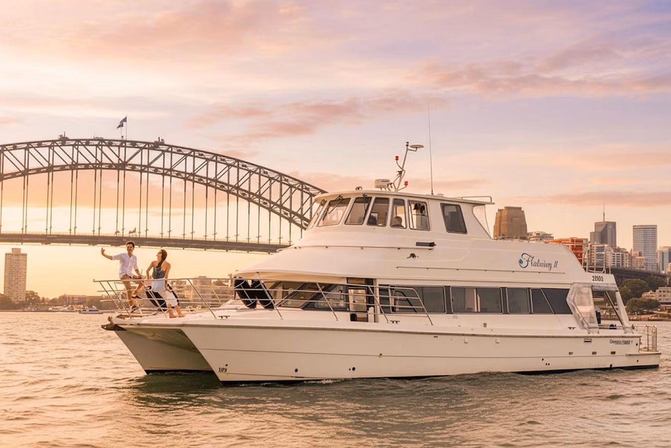 Step aboard Fleetwing II, a stylish multi-level power catamaran, for a 90-minute twilight cruise on Sydney Harbour. Watch as the city’s iconic landmarks — including the Opera House and Harbour Bridge — glow in the golden light of sunset before shimmering under the evening sky.